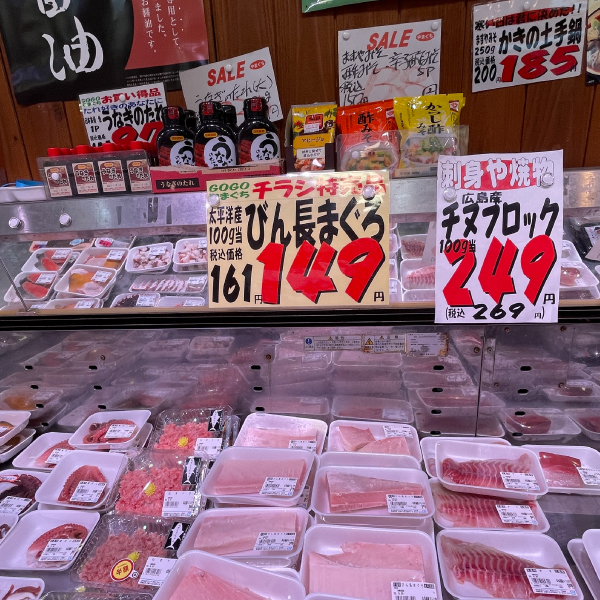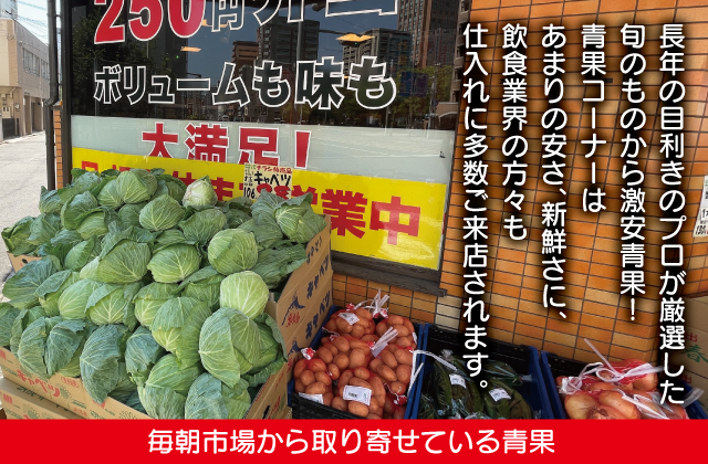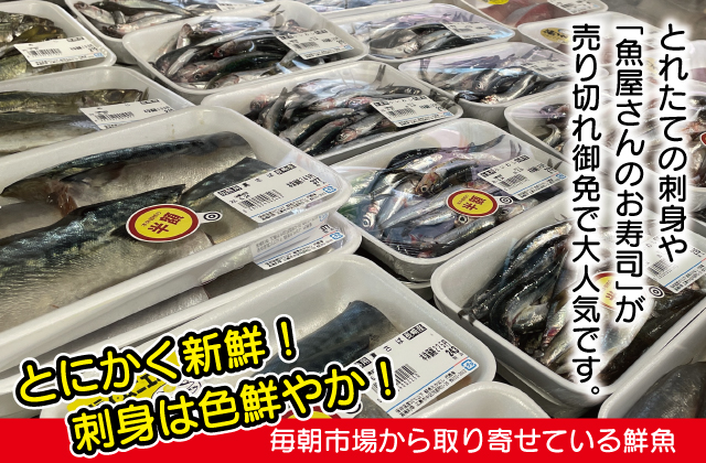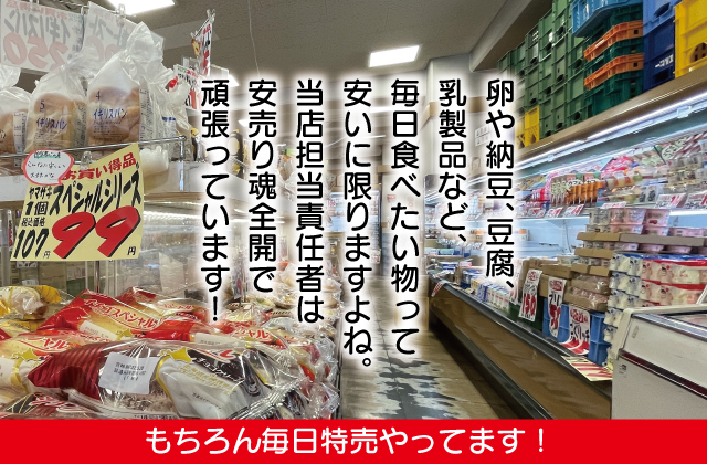 毎朝市場から仕入れている野菜、果物、精肉、鮮魚は鮮度抜群!旬のものはいち早く仕入れてお客様にお届けすることを心がけています。そして、これらの売り場でも目玉激安商品(黄色い値札)は要チェック!!