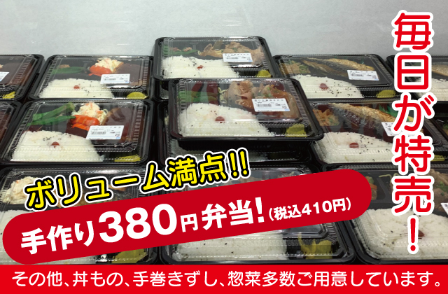 毎日手造りのお弁当やお総菜は、安くて美味しいと大人気!お値段!298円(税別)弁当は、リーズナブルで美味しいくボリューム満点!その他当店オリジナル地中海カレー、カツ丼、いなり寿司、海鮮巻きなどもおすすめです!目玉激安商品(黄色い値札)のチェックもお忘れなく。